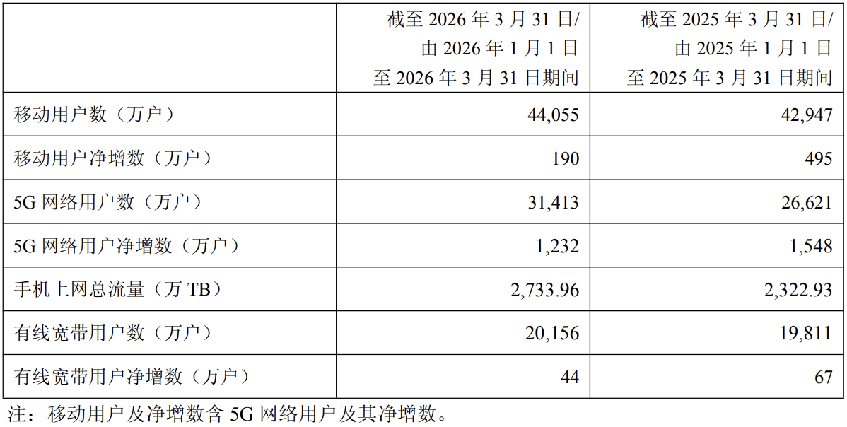 公司坚持以客户需求为导向,把握“AI+消费”升级新趋势,加快推动连接、终端、应用、权益等融合要素升级,持续提升个人及家庭端产品和服务的智能化供给能力,基础业务稳健发展,5G网络用户数达到 3.1 亿户,渗透率提升至 71.3%,手机上网总流量同比增长17.7%,手机上网DOU 达到 23GB,同比增长 12.6%,千兆宽带用户渗透率约 34%。