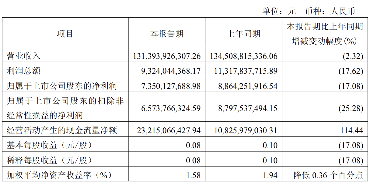 2026 年第一季度,公司营业成本为人民币 944 亿元,同比下降 0.5%;销售费用为人民币134亿元,同比下降 1.6%;管理费用为人民币 101 亿元,同比下降 2.6%;研发费用为人民币18亿元,同比增长 1.7%,主要为公司加快建设科技领军企业,持续加大关键核心技术攻关;财务费用为人民币 0.17 亿元,同比下降 80.4%。