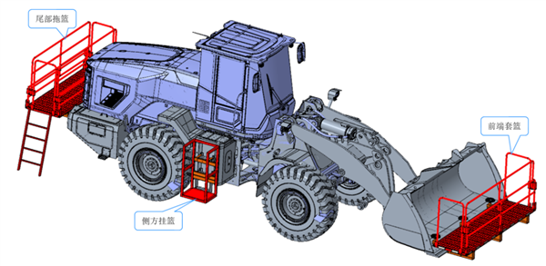 新装备很好地解决了这些问题,它由前端套篮、尾部拖篮、侧方挂篮三个模块组成,直接套装加装在现有铲车上,不用改动车身结构。