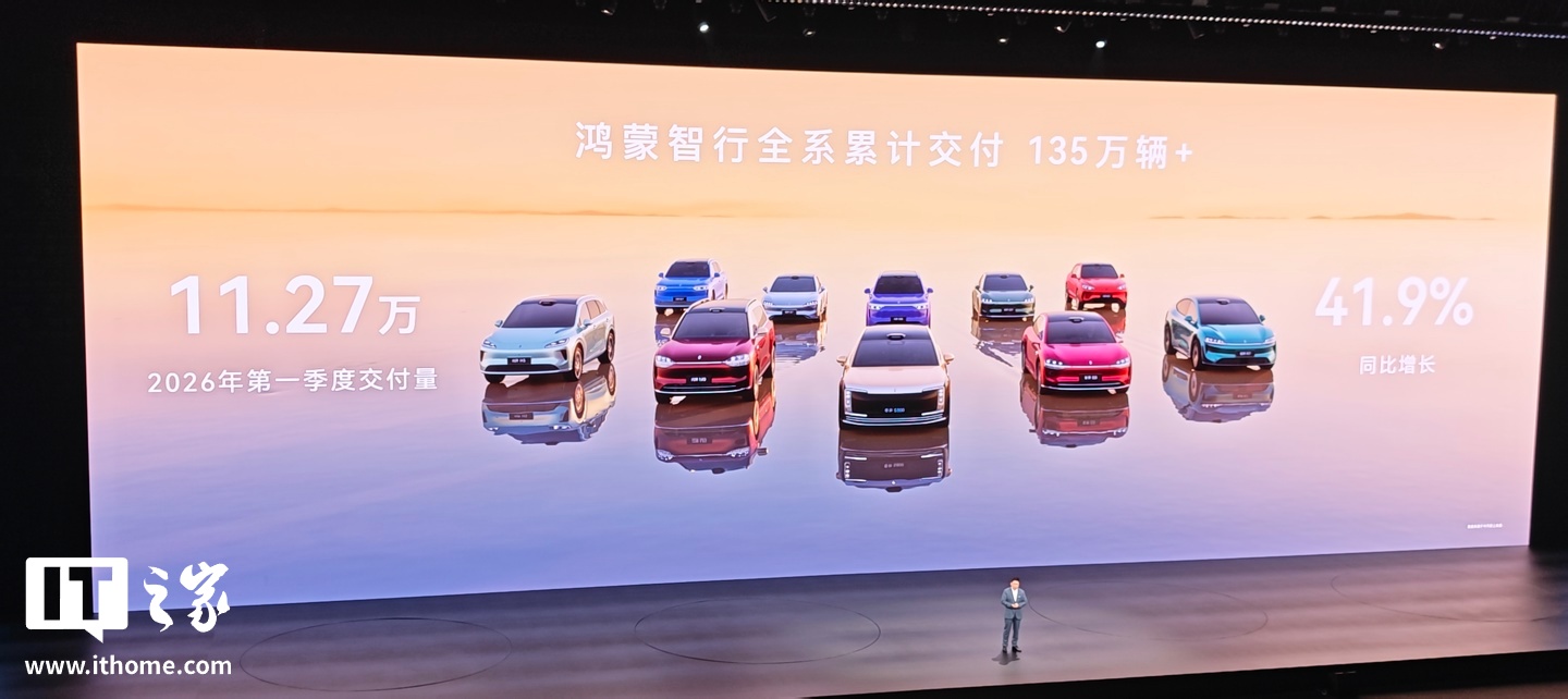 IT之家 4 月 22 日消息,在今天的鸿蒙智行春季新品发布会开场,华为常务董事、产品投资评审委员会主任、终端 BG 董事长余承东率先公布了销售数据:全系累计交付突破 135 万,2026 年第一季度交付量 11.27 万,同比增长 41.9%。