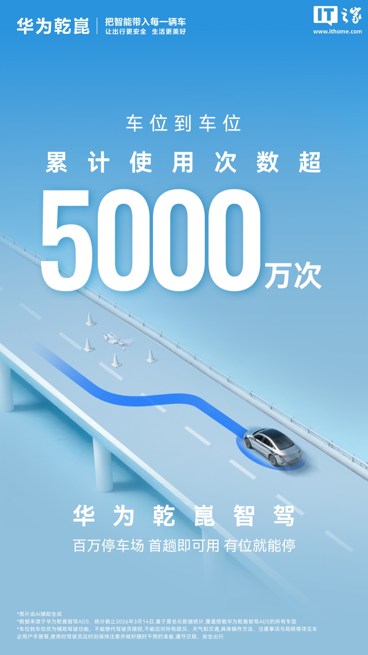 IT之家注意到,华为乾崑智驾在 ADS 4 版本就升级了 WEWA 架构,车位到车位功能升级到 2.0 版本,商场、写字楼、小区多场景全覆盖,适配百万停车场。根据华为官方在今年 3 月公布的数据,华为乾崑智驾车位到车位累计使用次数突破 5000 万次。