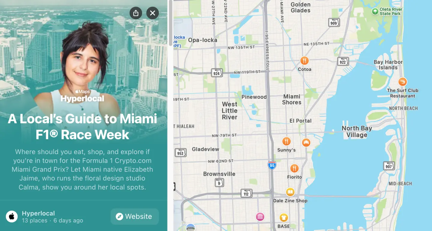 IT之家援引博文介绍,苹果同步发布了两份本地指南:“迈阿密 F1 赛车周本地指南”推荐周边餐饮购物场所,“F1 迈阿密赛车周精选地点”则帮助用户锁定赛道附近的绝佳观赛点位。