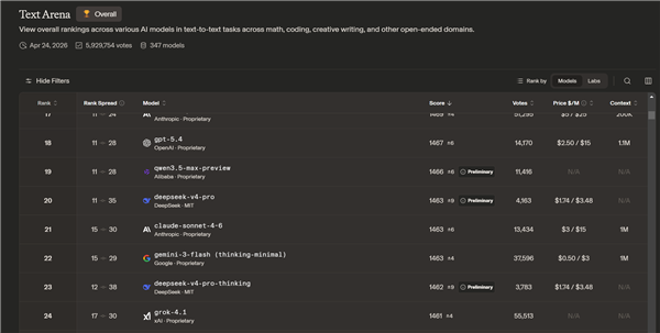 首先是arena.ai上的榜单,主要看text文本和code编程能力吧,图像、视觉之类的因为V4不支持多模态也没得比。