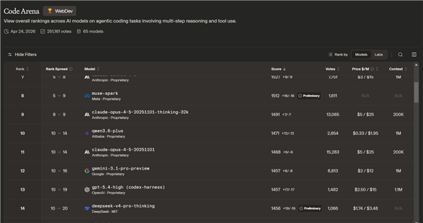 Code编程能力位列14,这方面国产最强的是GLM-5.1,位列第5名。