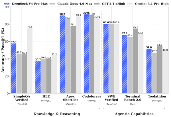 DeepSeek官方也在发布说明中提到了V4的性能,相比前代模型DeepSeek-V4-Pro的 Agent能力显著增强。