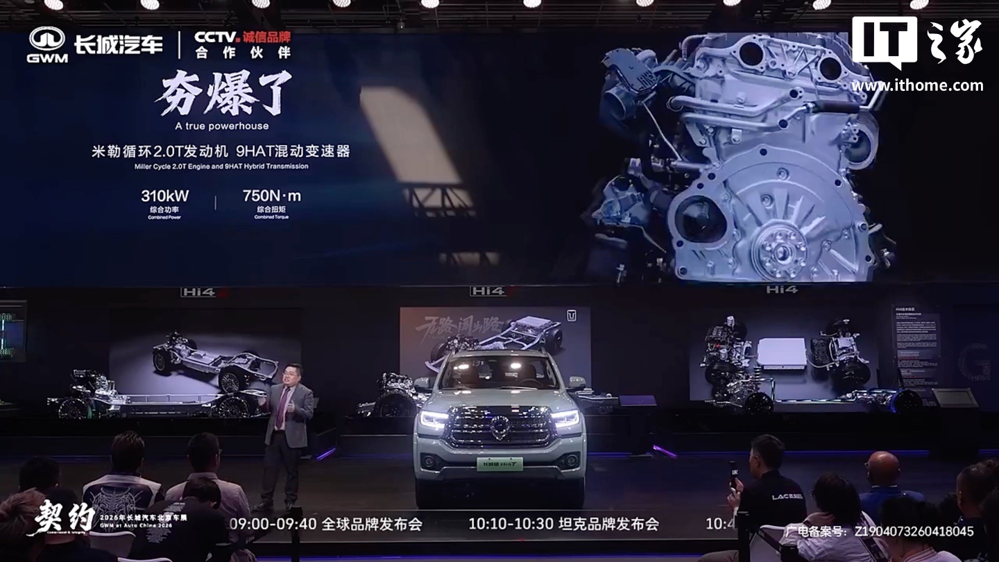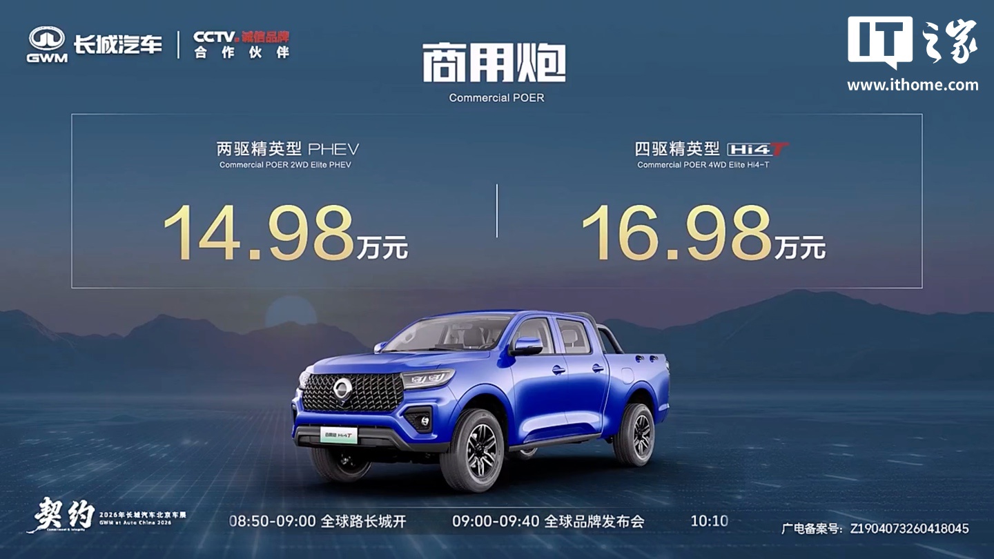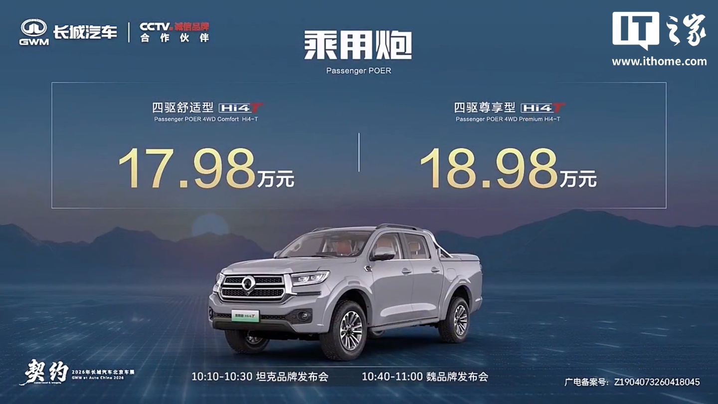 IT之家 4 月 24 日消息,在 2026 北京车展上,长城炮 Hi4-T 皮卡正式发布,预售价 14.98 万元起: