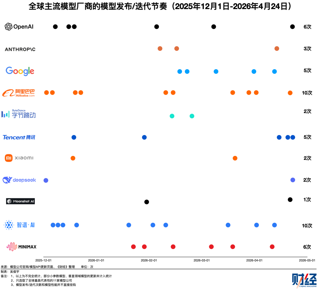 据《财经》不完全统计, 2025 年 12 月 1 日 -2026 年 4 月 24 日,美国市场( OpenAI 、 Anthropic 、谷歌 Gemini )和中国(包括阿里千问、字节跳动豆包、腾讯混元、小米 MiMo 、 DeepSeek 、月之暗面、智谱、 MiniMax )的 11 家主流模型公司,在 144 天内至少发布或迭代了 53 款模型, 几乎每 2.7 天就会有一款模型发布或迭代。