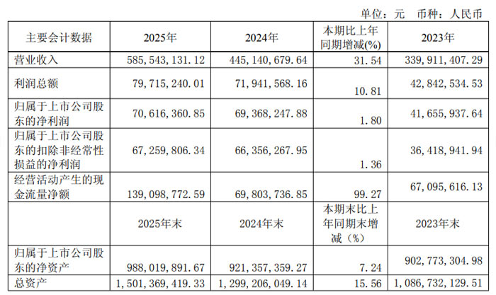 年报显示,2025 年腾景科技实现营业总收入 5.86 亿元,同比增长 31.54%;实现利润总额 0.80 亿元,同比增长 10.81%;归属于上市公司股东的净利润 0.71 亿元,同比增长 1.80%;归属于上市公司股东的扣除非经常性损益的净利润 0.67 亿元,同比增长 1.36%。经营活动产生的现金流量净额 1.39 亿元,同比大幅增长 99.27%,盈利质量稳步提升。