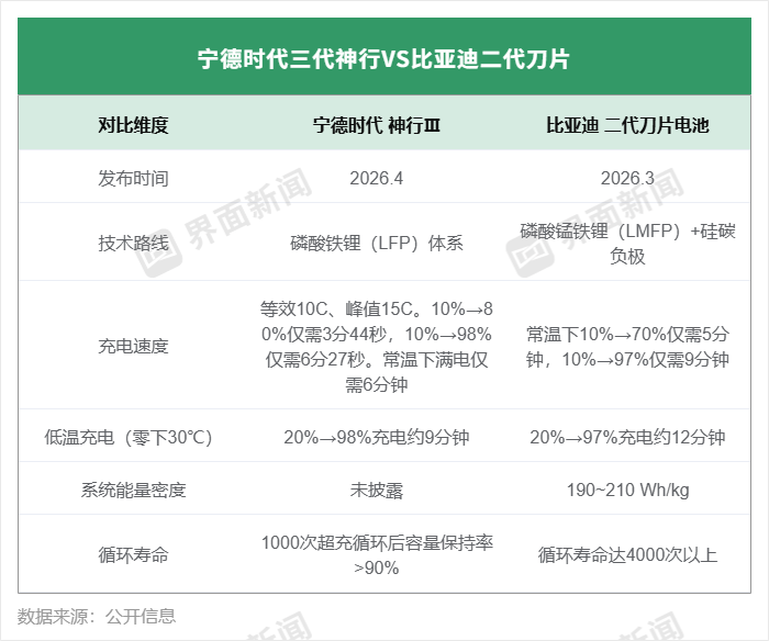 第三代神行超充电池一出,宁德时代在充电速度上又重获了“行业第一”—— 同为磷酸铁锂,其在常温与极寒下的超充性能,均压过比亚迪第二代刀片电池一头。