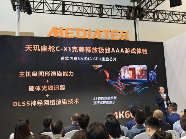 除了核心的智能体座舱方案,联发科在现场还展示了基于 C-X1 平台的车载 3A 游戏解决方案。依托集成的 NVIDIA RTX GPU 光线追踪技术与 NVIDIA DLSS 技术,这套方案可实现最高 4K@60FPS 的图形渲染能力,补齐了座舱沉浸式娱乐的体验短板。