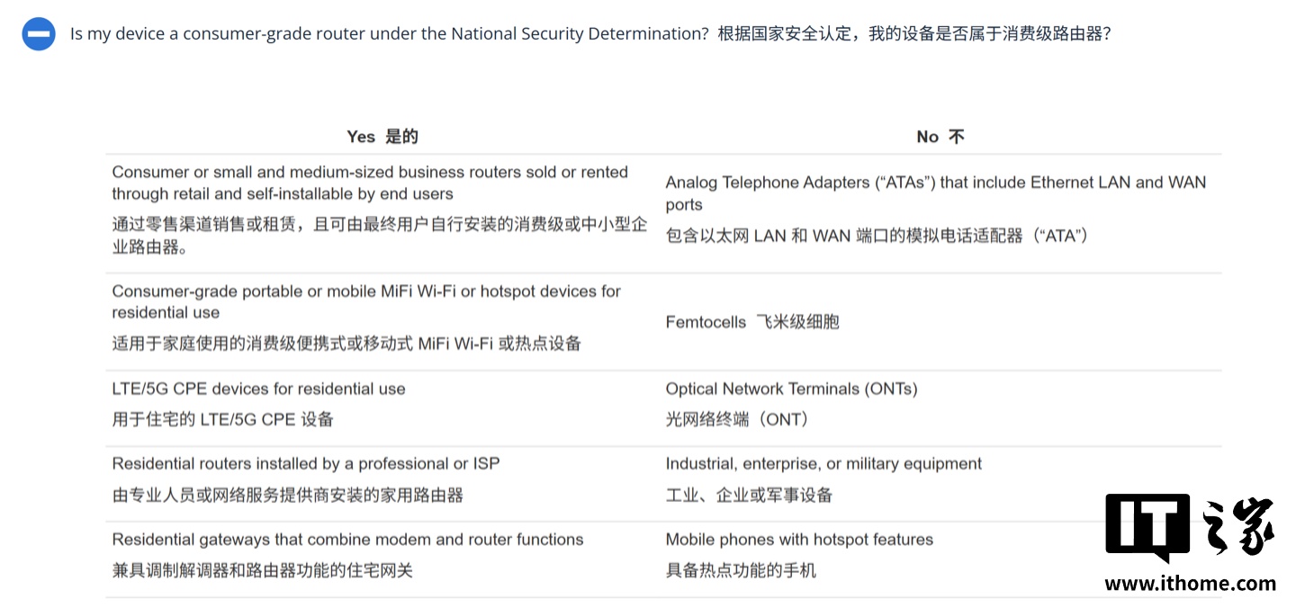 IT之家在此援引 Android Authority,FCC 在官网表示,这项禁令已经扩展至“消费级便携 / 移动 Wi-Fi 热点设备”和“用于住宅的 LTE/5G CPE 设备”。其中前者指的是随身 Wi-Fi;后者则指的是使用 SIM 卡接入蜂窝网络,然后提供家庭互联网的设备。