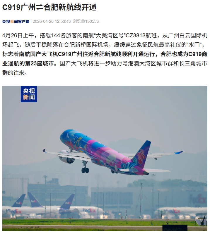 IT之家 4 月 26 日消息,据央视新闻报道,4 月 26 日上午,搭载 144 名旅客的南航“大美湾区号”CZ3813 航班,从广州白云国际机场起飞,随后平稳降落在合肥新桥国际机场,缓缓穿过象征民航最高礼仪的“水门”,标志着南航国产大飞机 C919 广州往返合肥新航线顺利开通运行,合肥也成为 C919 商业通航的第 23 座城市。