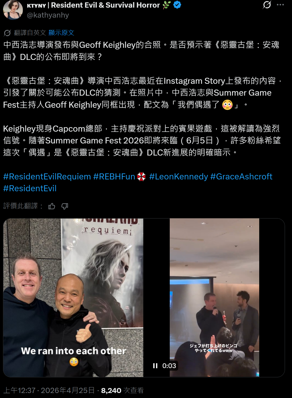 据《生化危机:安魂曲》导演中西晃史发文,本次派对上展出了以里昂、格蕾丝为主题的蛋糕。并且 TGA 创办人、主持人杰夫 · 基思利(Geoff Keighley)也出席活动,主持“派对宾果”活动。