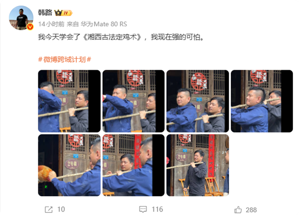 没过多久,他又分享自己学会了湘西古法定鸡术,还调侃自己现在强得可怕。
