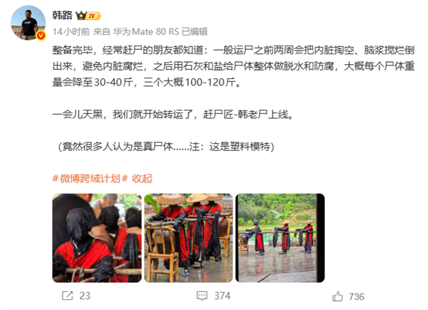 不少网友看到后被吓到,以为是真的尸体,韩路很快补充说明,用到的都是塑料模特。他还自嘲化身赶尸匠韩老尸,整活效果拉满。