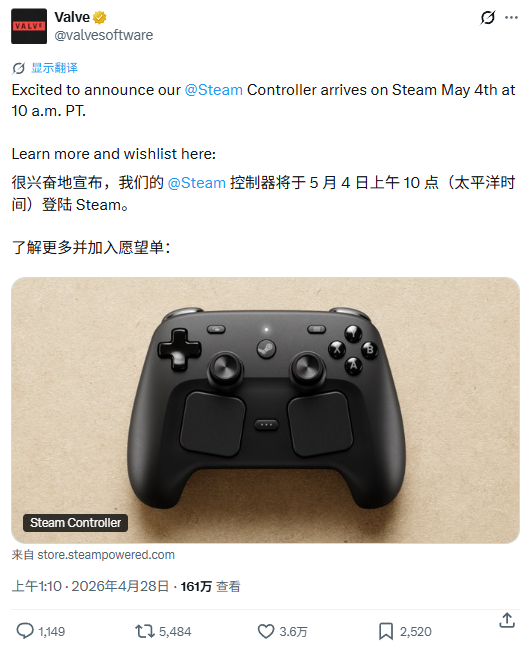 IT之家 4 月 28 日消息,Valve 今日宣布,新一代 Steam 控制器将于北京时间 5 月 5 日凌晨一点率先发售,而 Steam Machine 主机和 VR 设备 Steam Frame 暂无新进展。