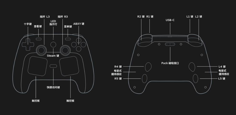 Steam 手柄配备 A B X Y 键、十字键、左右模拟扳机键、左右缓冲键、查看键和菜单键、Steam 键和快捷访问键、4 个可分配的握持键、2 个全尺寸 TMR 磁性摇杆(带电容式触控功能)、6 轴 IMU 陀螺仪。