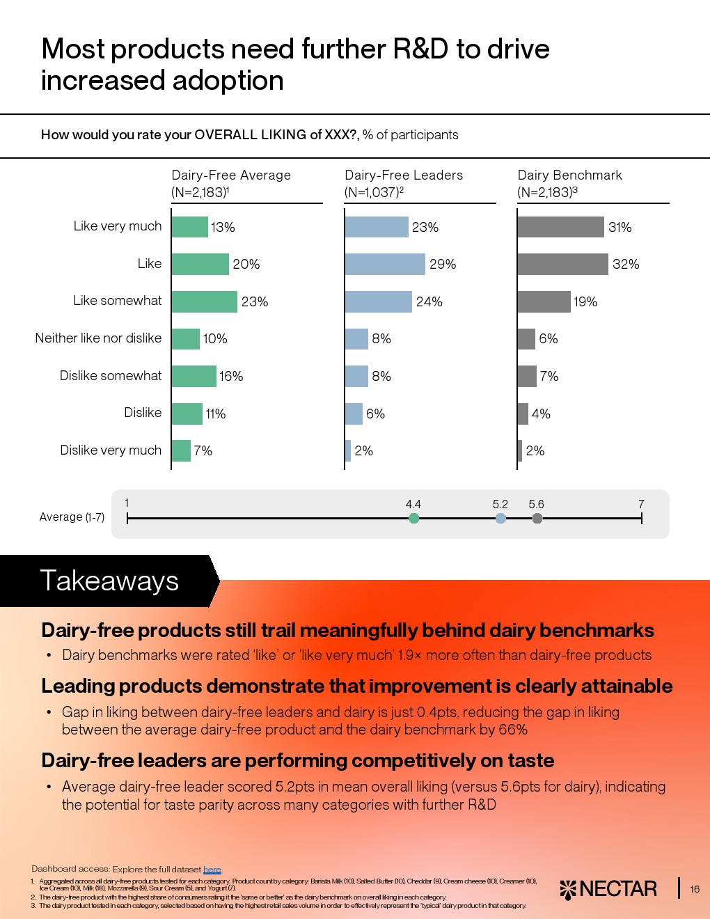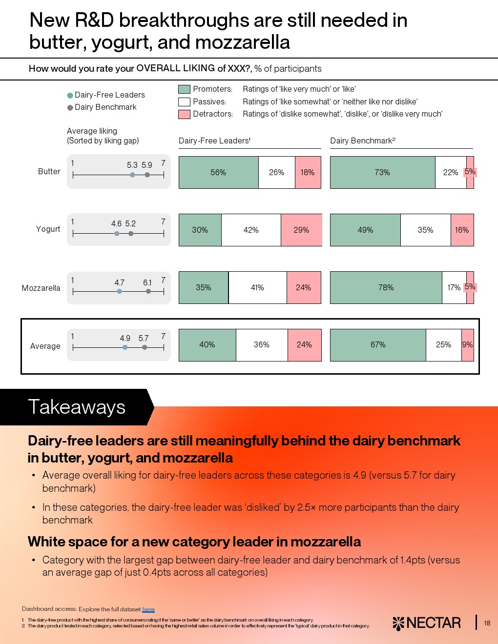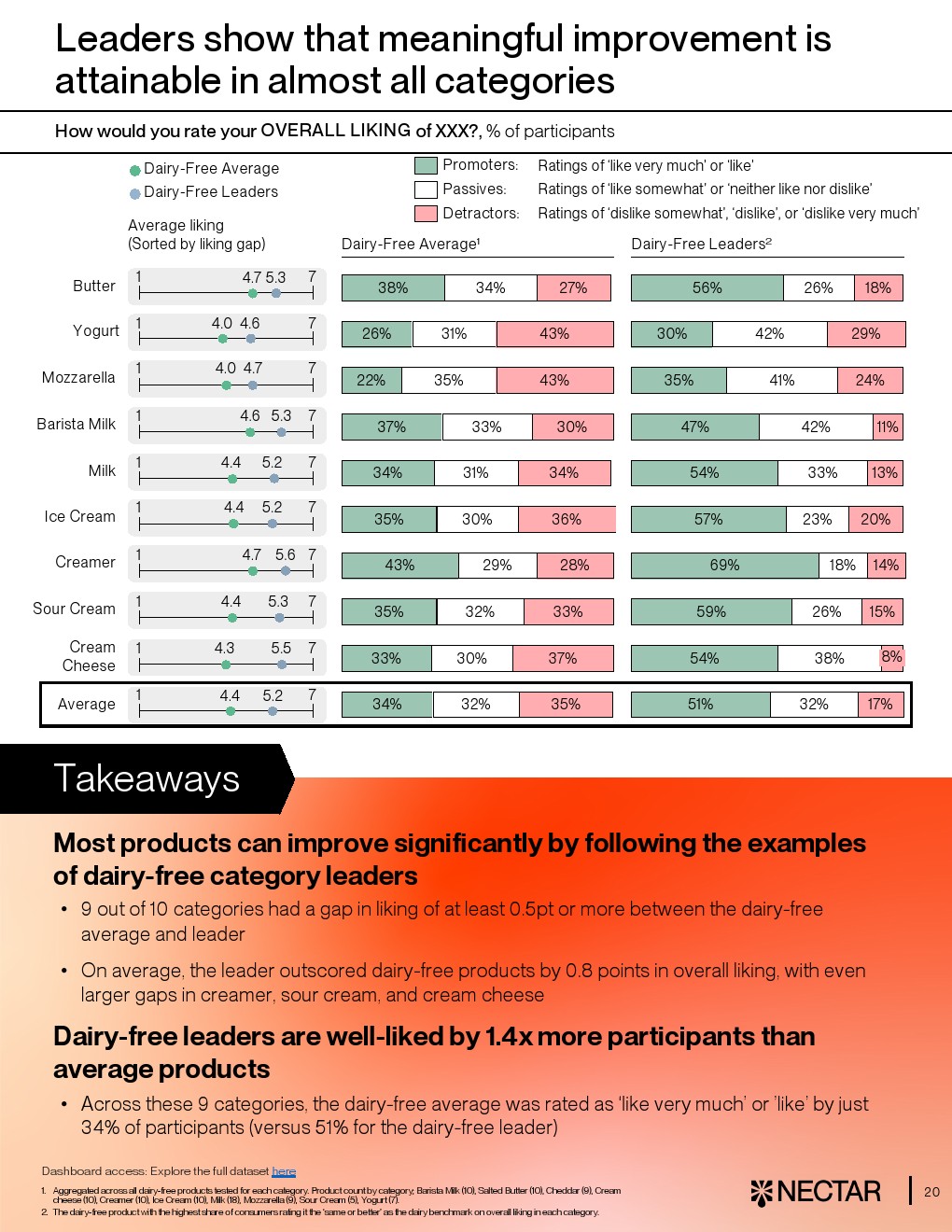 然而行业整体仍处于“局部突破、整体落后”的阶段。平均而言,仅33%的消费者对无乳产品给出“喜欢”或“非常喜欢”,而传统乳制品这一比例达63%。在10大品类中,有8类平均评分落后至少1分,尤其是马苏里拉奶酪、酸奶和黄油,差距达1.3至2.1分。即便是各品类最佳产品,其平均得分仍为5.2分,低于乳制品的5.6分,显示技术与感官差距仍未完全弥合 。