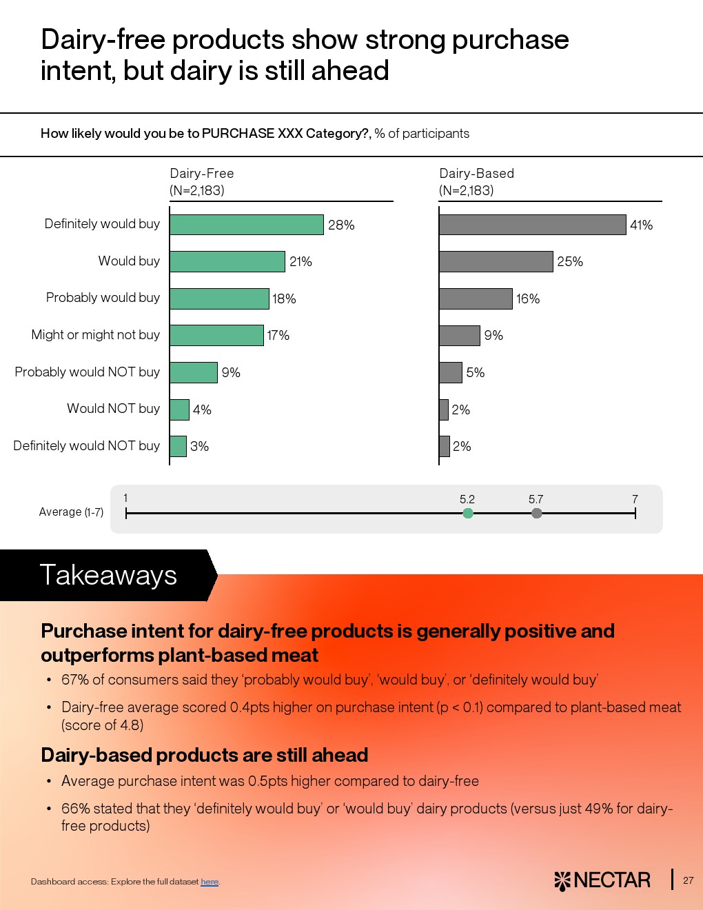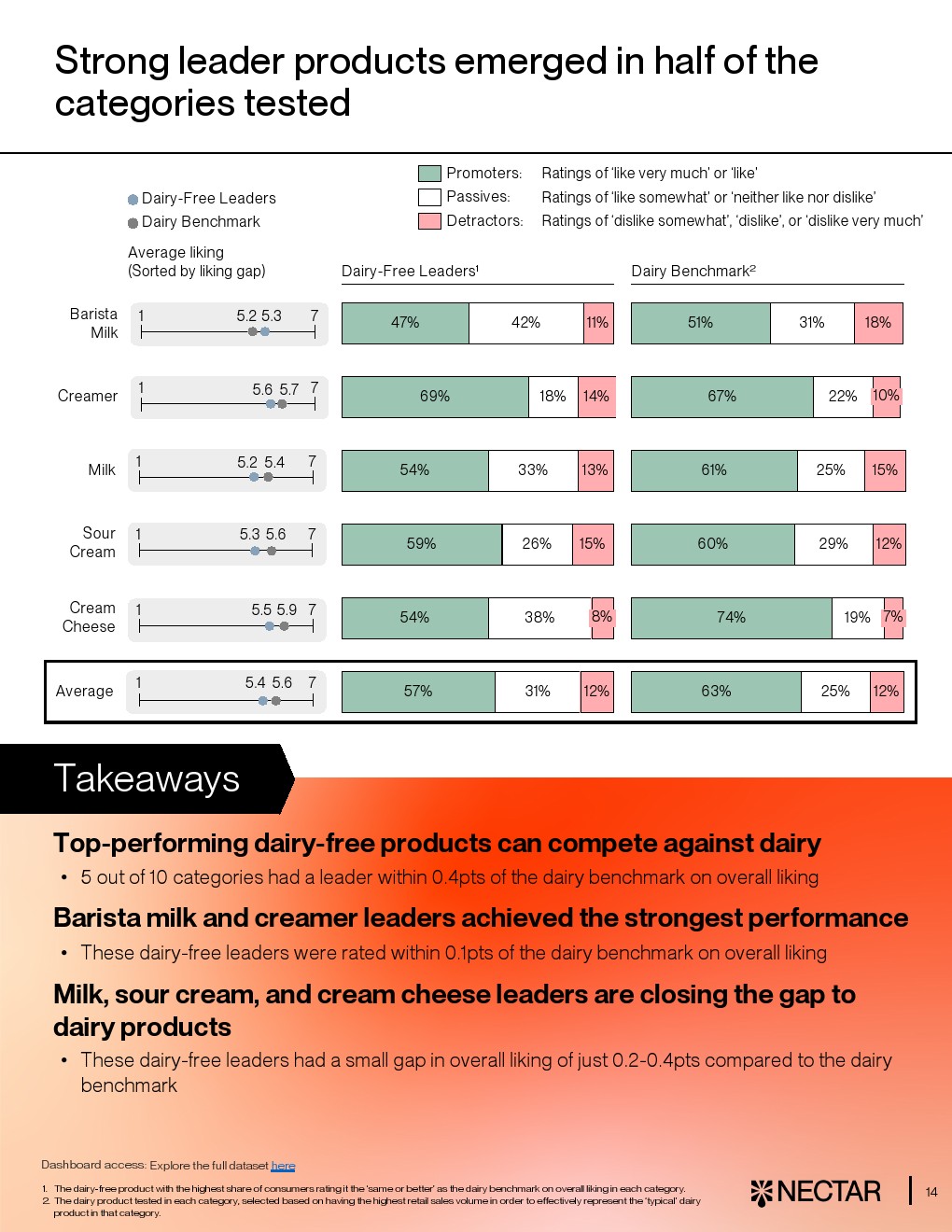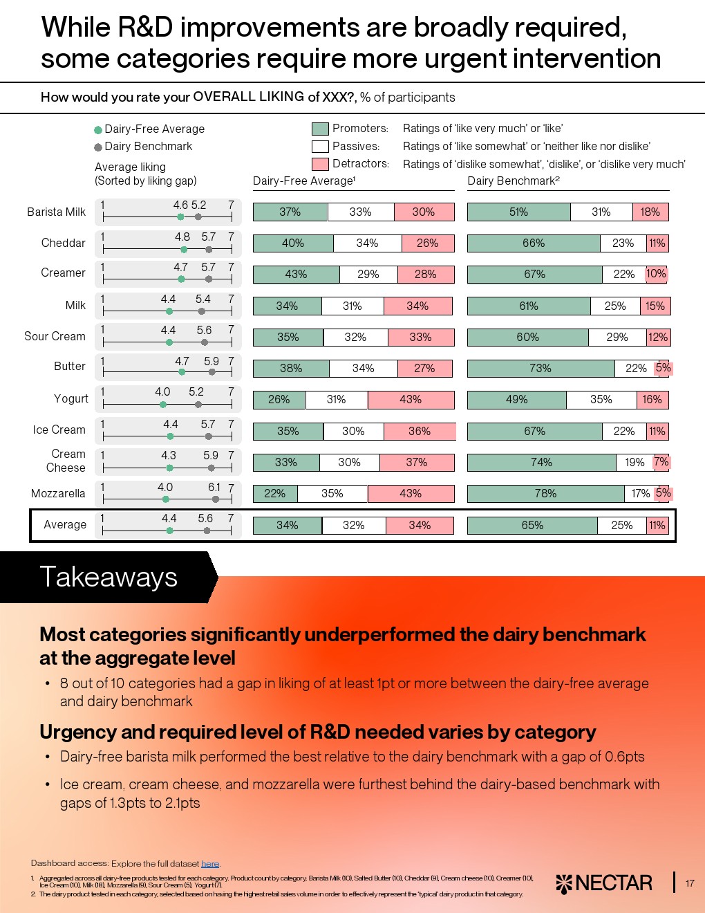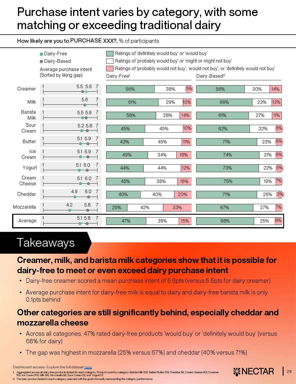 然而行业整体仍处于“局部突破、整体落后”的阶段。平均而言,仅33%的消费者对无乳产品给出“喜欢”或“非常喜欢”,而传统乳制品这一比例达63%。在10大品类中,有8类平均评分落后至少1分,尤其是马苏里拉奶酪、酸奶和黄油,差距达1.3至2.1分。即便是各品类最佳产品,其平均得分仍为5.2分,低于乳制品的5.6分,显示技术与感官差距仍未完全弥合 。