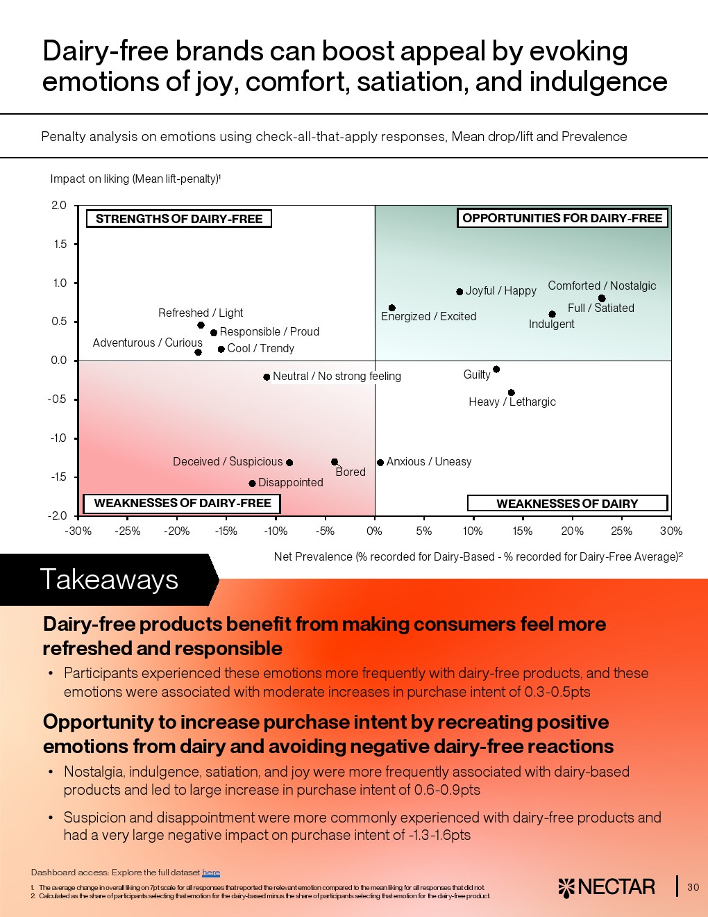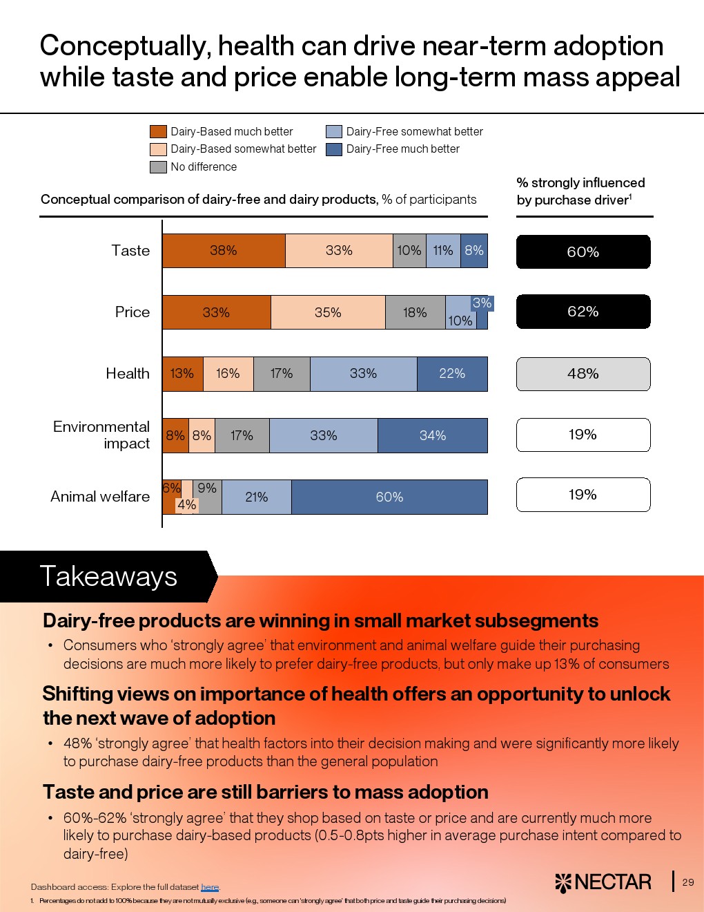 在消费与营销层面,无乳制品已具备一定接受度。约67%消费者表示“可能或愿意购买”,但仍低于传统乳制品的66%“明确愿意购买”。细分来看,奶精、液态奶及咖啡奶已实现或接近购买意愿持平,而奶酪类仍明显落后。与此同时,48%消费者将健康作为重要决策因素,情绪价值如“愉悦”“满足感”可提升0.6至0.9分购买意愿,表明品牌叙事仍有提升空间 。
