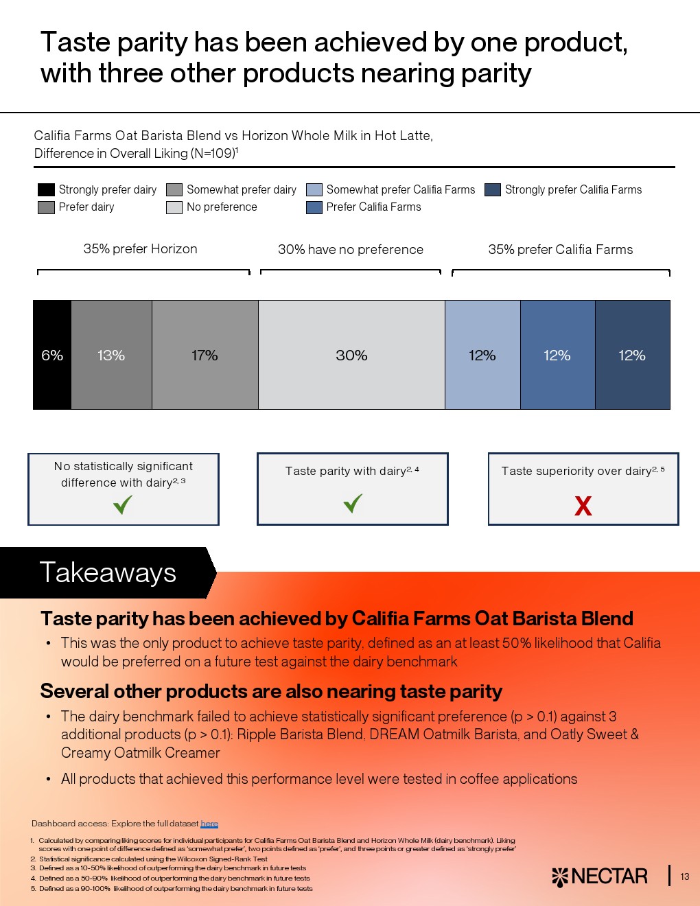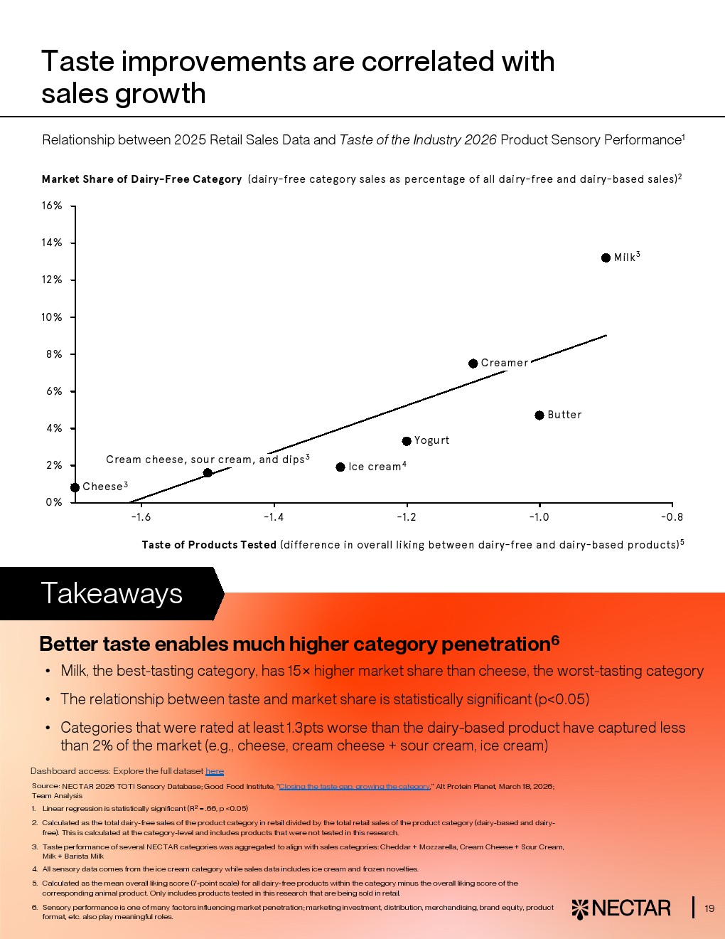 数据进一步揭示,口味是决定市场渗透的核心变量。口感评分与市场份额呈显著正相关,统计显著性p<0.05。表现最佳的植物奶品类市场份额约为奶酪的15倍,而后者正是口感差距最大的品类。对于评分落后1.3分以上的品类,其市场渗透率普遍低于2%。这意味着风味改进不仅是产品问题,更直接关系商业规模扩张 。
