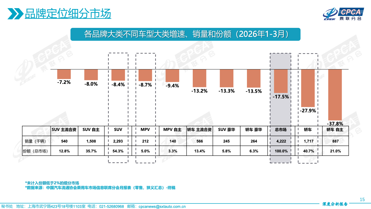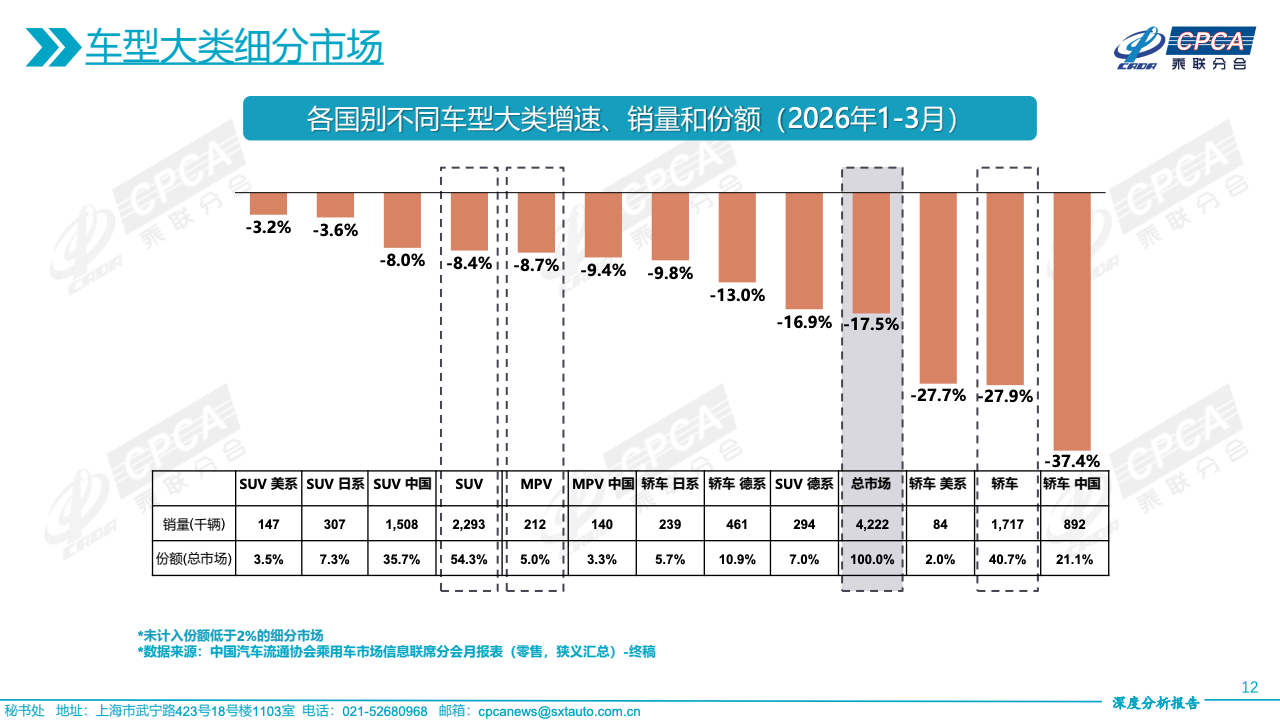 从车型结构来看,市场分化进一步加剧。SUV依然占据主导地位,3月零售89.4万辆,占总市场比重54%以上,且批发同比增长15.3%,表现出较强韧性。相比之下,轿车与MPV持续承压,轿车零售同比下降25.1%,MPV下降11.9%。累计数据同样印证这一趋势,一季度SUV仍保持正增长,而轿车累计零售下降27.9%,表明消费者偏好正持续向SUV倾斜,结构性替代已进入深水区。