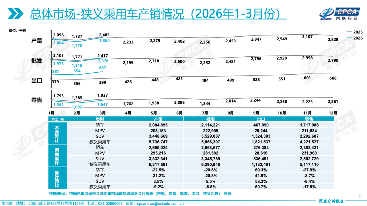 整体而言,中国乘用车市场正从总量扩张阶段转向结构重塑阶段。一方面,出口持续高增长成为对冲内需波动的关键支柱;另一方面,SUV与高端车型不断提升市场权重,推动产品结构上移。同时,低端市场加速收缩,消费分层趋势愈发明显。未来,行业增长逻辑将更加依赖全球化布局与产品升级能力,市场竞争也将由规模竞争转向结构与质量竞争。