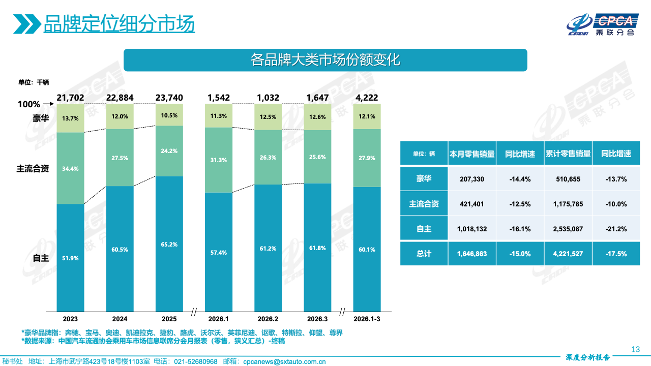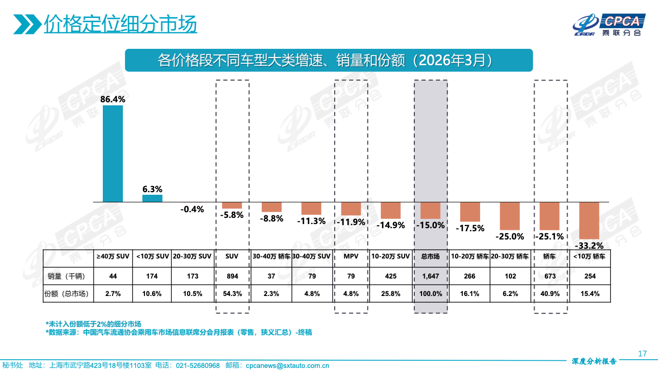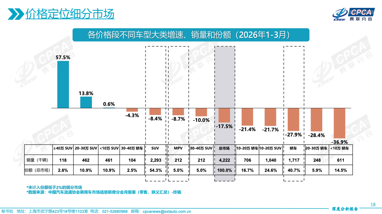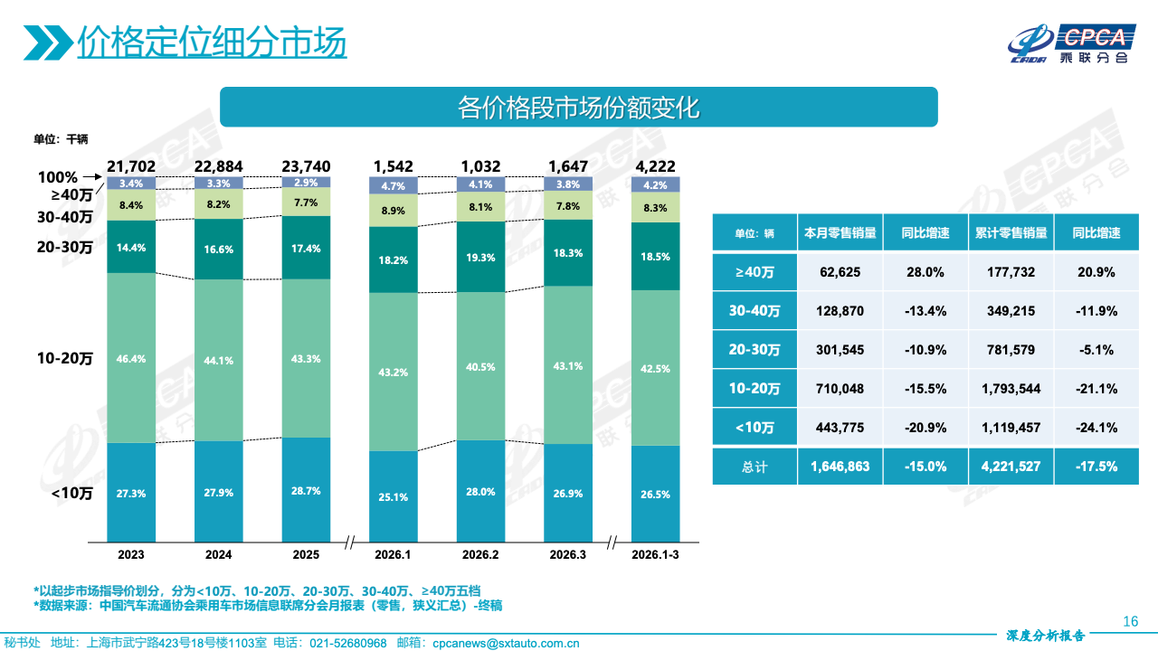 价格结构的变化进一步揭示需求分层。40万元以上高端市场逆势增长28.0%,成为唯一实现正增长的价格区间,显示高净值消费群体需求依旧稳健。20-30万元区间降幅收窄至10.9%,具备一定抗压能力,而10-20万元主流区间下降15.5%,仍是最大规模但明显承压。10万元以下市场降幅达20.9%,需求收缩最为显著,反映价格敏感型消费者信心不足,市场重心正向中高端迁移。