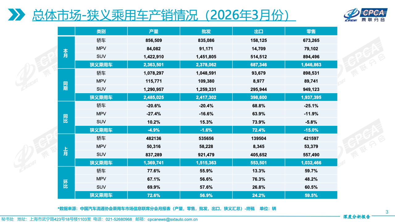 2026年3月乘用车市场整体呈现“出口强劲、内需走弱”的分化格局。狭义乘用车批发237.8万辆,同比仅下降1.6%,但零售164.7万辆,同比大幅下滑15.0%,显示终端需求明显承压。与此同时,出口达到68.7万辆,同比激增72.4%,成为支撑行业的核心变量。从环比看,零售增长59.5%,反映春节后需求季节性修复,但整体恢复力度仍不足以扭转同比下行趋势。