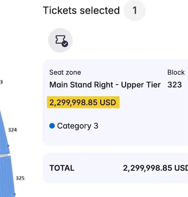 近期,该官方转售平台已出现天价待售门票,共计4张球票挂出超高定价,单张标价高达2299998.85美元(折合成人民币约1572万元)。