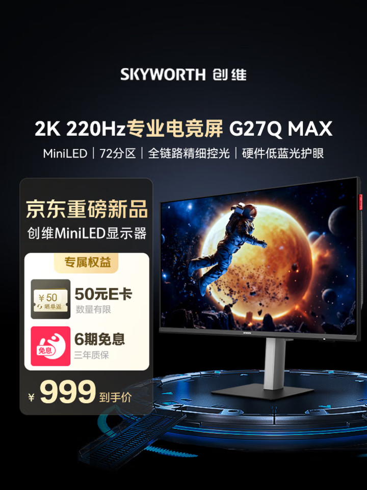 PChome4月28日消息,创维新款G27Q MAX电竞显示器在京东正式开启预售,定价仅999元,以千元价位搭载QD-Mini LED背光、220Hz高刷等旗舰级配置,大幅刷新同规格产品的性价比纪录。