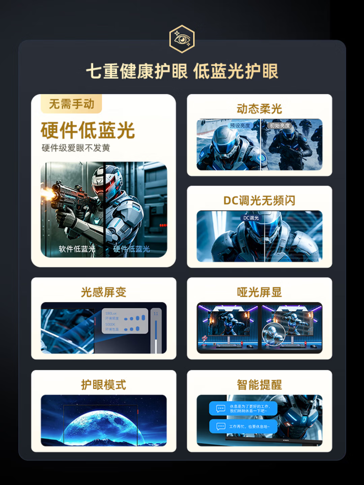 游戏性能方面,显示器原生220Hz刷新率,可超频至250Hz,配合1ms GTG响应时间,画面流畅无拖影;同时支持Adaptive-Sync防撕裂技术,完美适配NVIDIA与AMD双平台显卡。设备内置动态OD特调、暗部增强、战术手电筒等游戏辅助功能,针对性优化FPS游戏场景,提升操作跟手性与战场辨识度。