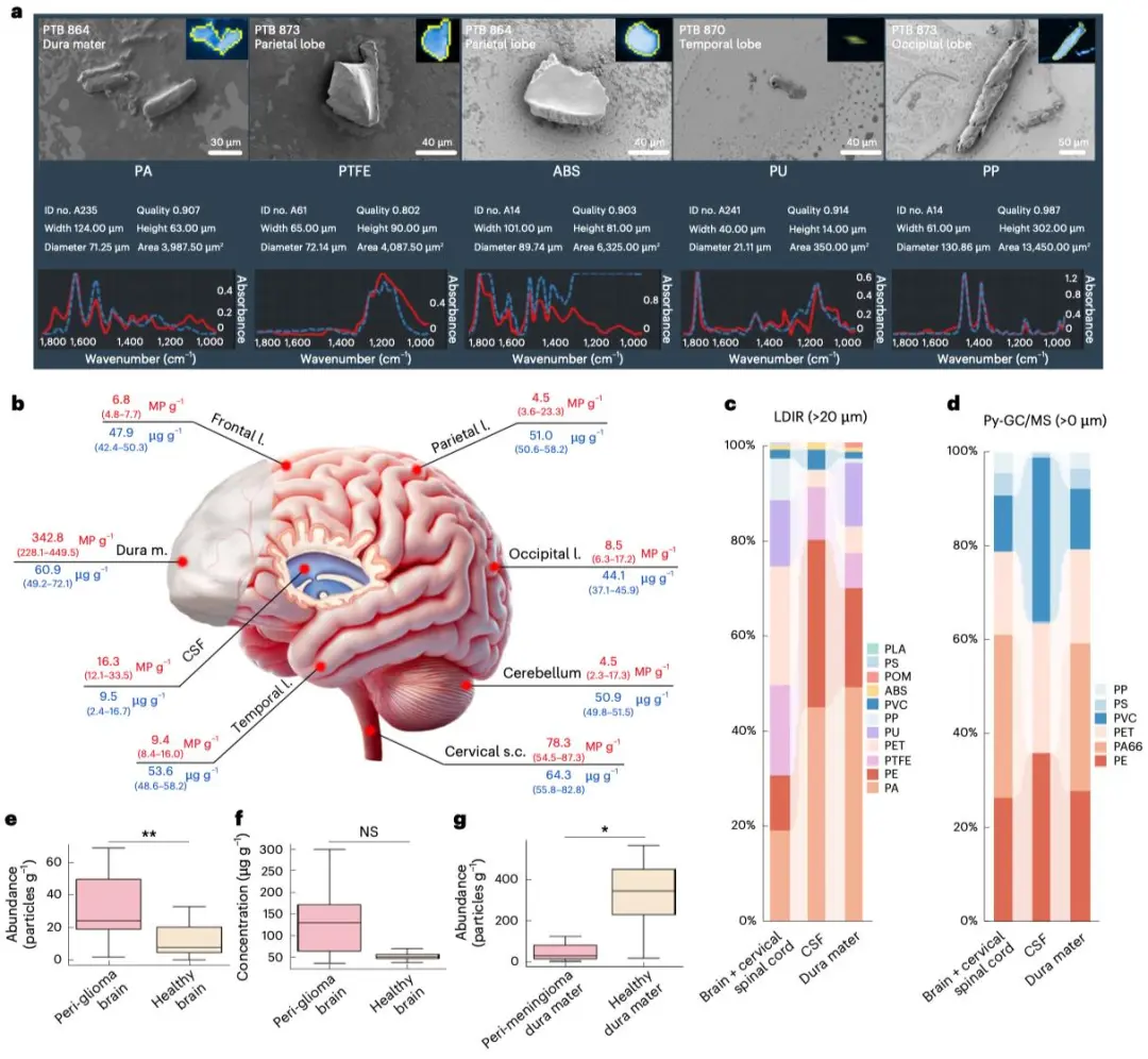 据介绍,这项研究历时 4 年完成。团队共纳入包括 113 例脑肿瘤患者的 156 份病变相关样本及 5 位健康供体的 35 份脑组织样本 —— 这也是目前最大规模的人脑样本研究队列,通过联合应用激光直接红外成像、热裂解气相色谱-质谱、光热红外光谱和扫描电镜等多种分析技术对这 191 份样本进行分析,结果显示 99.4% 的病变脑样本和 100% 健康脑样本中均检测到微 / 纳米塑料。研究团队通过多技术交叉验证,在胶质瘤冷冻切片中获得了塑料颗粒的显微证据,增强了结果的可靠性。