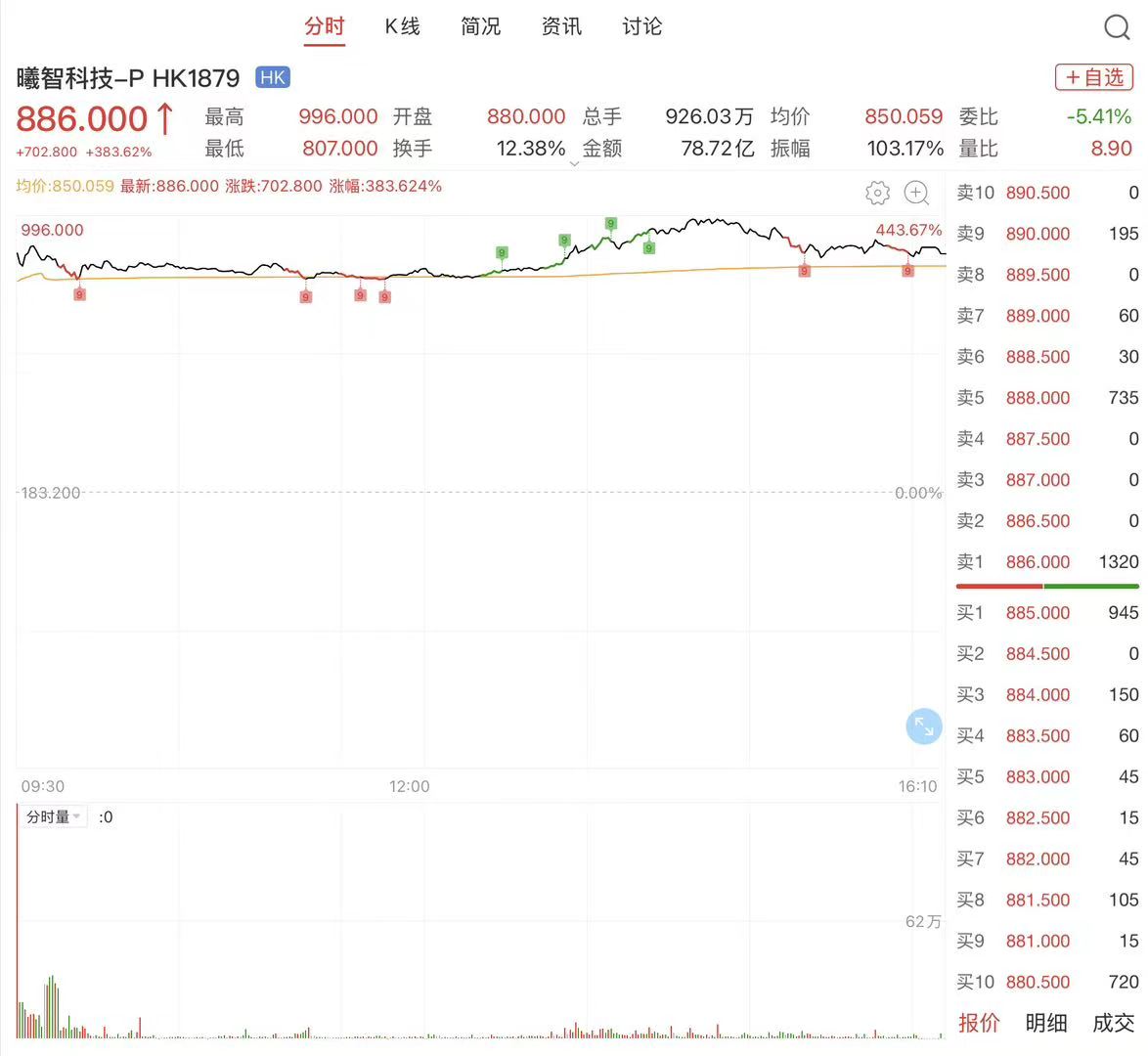 截至428日收盘,曦智科技收涨383.62%,报收886港元/股,总市值约815亿港元。