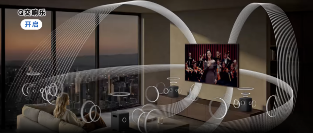 在与三星电视联动使用时,画境艺术音响7系还能进一步解锁Q交响乐功能,为整体影音体验带来额外提升。该功能支持与2022-2026 年款的三星电视协同使用,能够智能分析播放场景,自动识别三星电视与三星画境艺术音响5系、7系的相对位置,并进行精准校准与同步发声,使整个空间呈现理想音效。