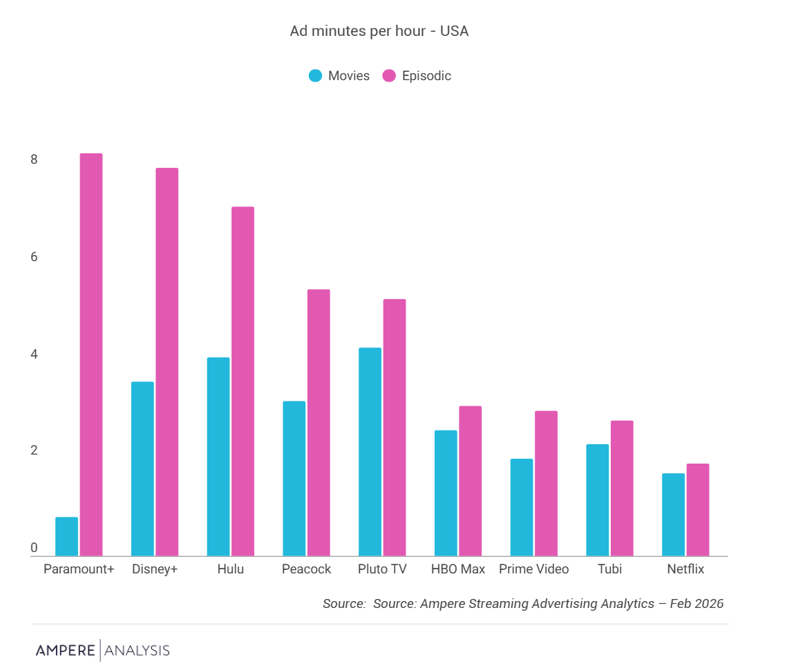 电影是昂贵的高端内容。虽然这可能导致更高的广告加载量来证明投资的合理性,但实际情况恰恰相反。优质的首轮流媒体电影可能带有广告限制,但它们仅占总观看时间的一小部分。电影依赖于维持叙事和影院沉浸感,因此广告中断通常不那么频繁,以符合观看体验。相比之下,电视剧自然产生更多的广告机会,因为剧集内容在剧集期间和剧集之间都有天然的间断点,从而实现更高的广告加载量。