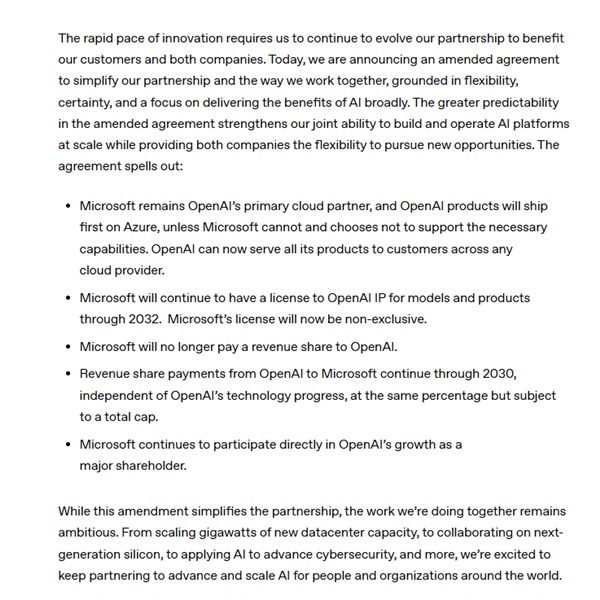 然而在4月27日,微软与OpenAI双双在官网发布了一份公告“修订后的协议,厘清长期合作细则(Amended Agreement Provides Long-Term Clarity)”,对两家公司延续七年的合作框架作出重大调整。