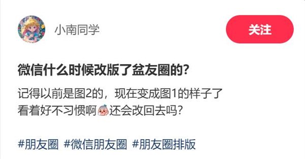 目前,该排版变化似乎仍处于灰度测试或逐步覆盖阶段。不少用户反映,自己的朋友圈依然维持着旧版样式。