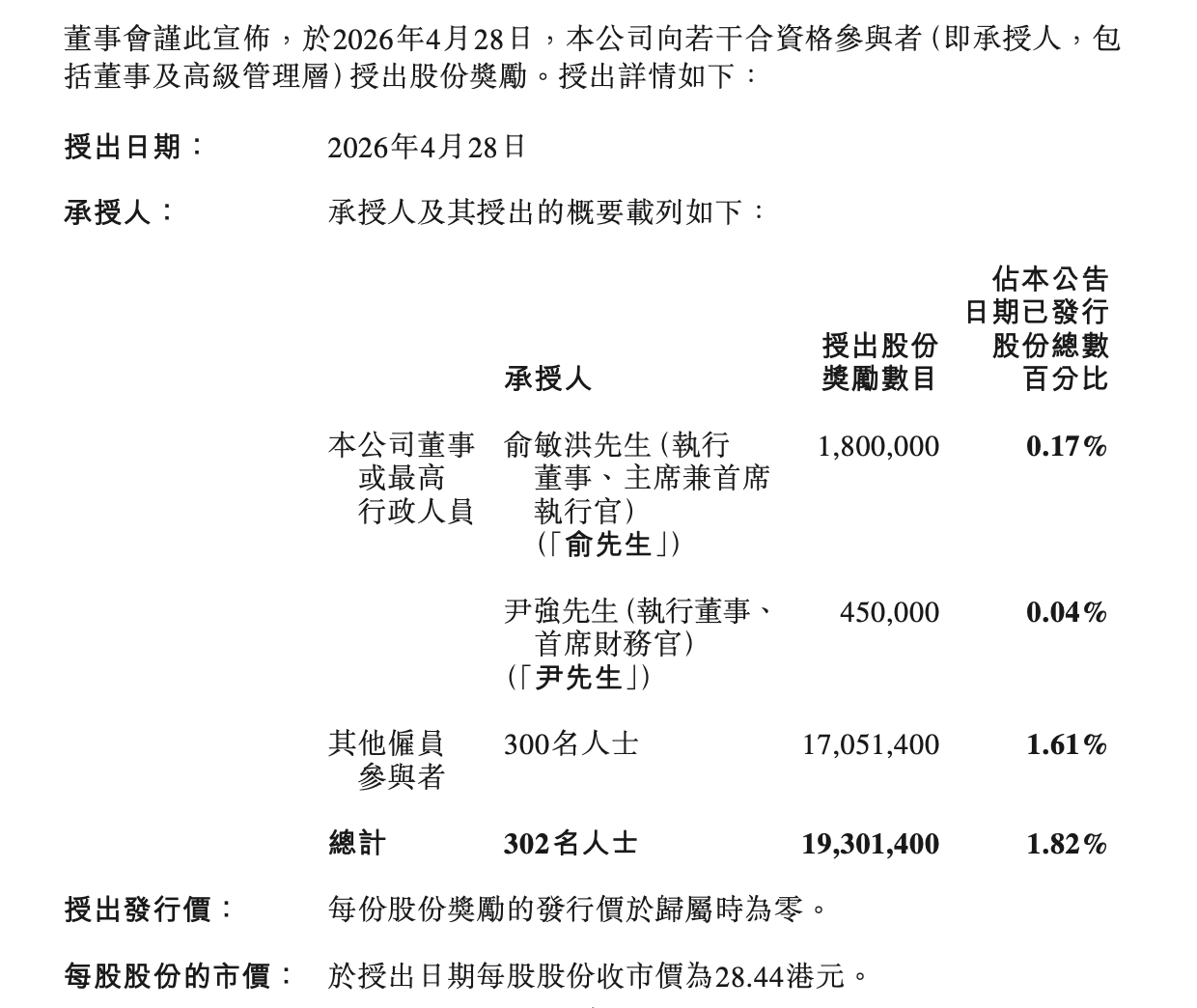 主播 F4 集体出走后,东方甄选奖励俞敏洪等 302 人共 1930 万股、价值约 5.49 亿港元