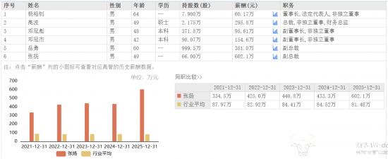 张扬2025年薪酬为602.1万元,相较于2024年的433.3万元,上涨了168.8万元,为公司高管中薪酬上涨幅度最大的。此外,张扬还是公司管理层中唯一薪酬超600万元,其余人薪资水平均在400万元以下,也就是说,他为公司中的最高薪酬,比总裁兼财务总监高波还高,后者薪酬为295.8万元。