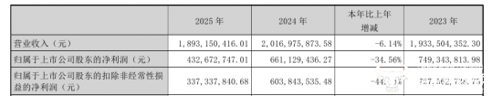 敷尔佳披露的业绩情况显示,公司报告期内实现营业收入18.93亿元,较2024年同期的20.17亿元下滑6.14%,跌出20亿元阵营,归母净利润由上年同期的6.61亿元下降至4.33亿元,减少了34.56%,净利润已连续三年下滑,而这也是敷尔佳自有公开数据以来,首次出现营收、净利润均呈负增长的情况。
