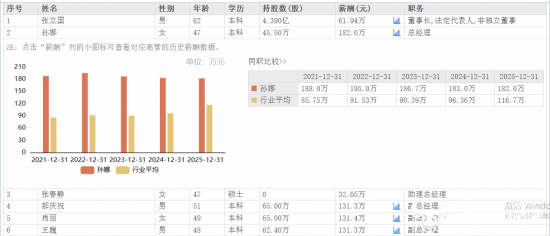 而总经理孙娜2025年薪酬由2024年同期的183.0万元下调至182.0万元,但其仍为公司管理层中的最高薪酬,比董事长张立国还高,后者薪酬为61.94万元。